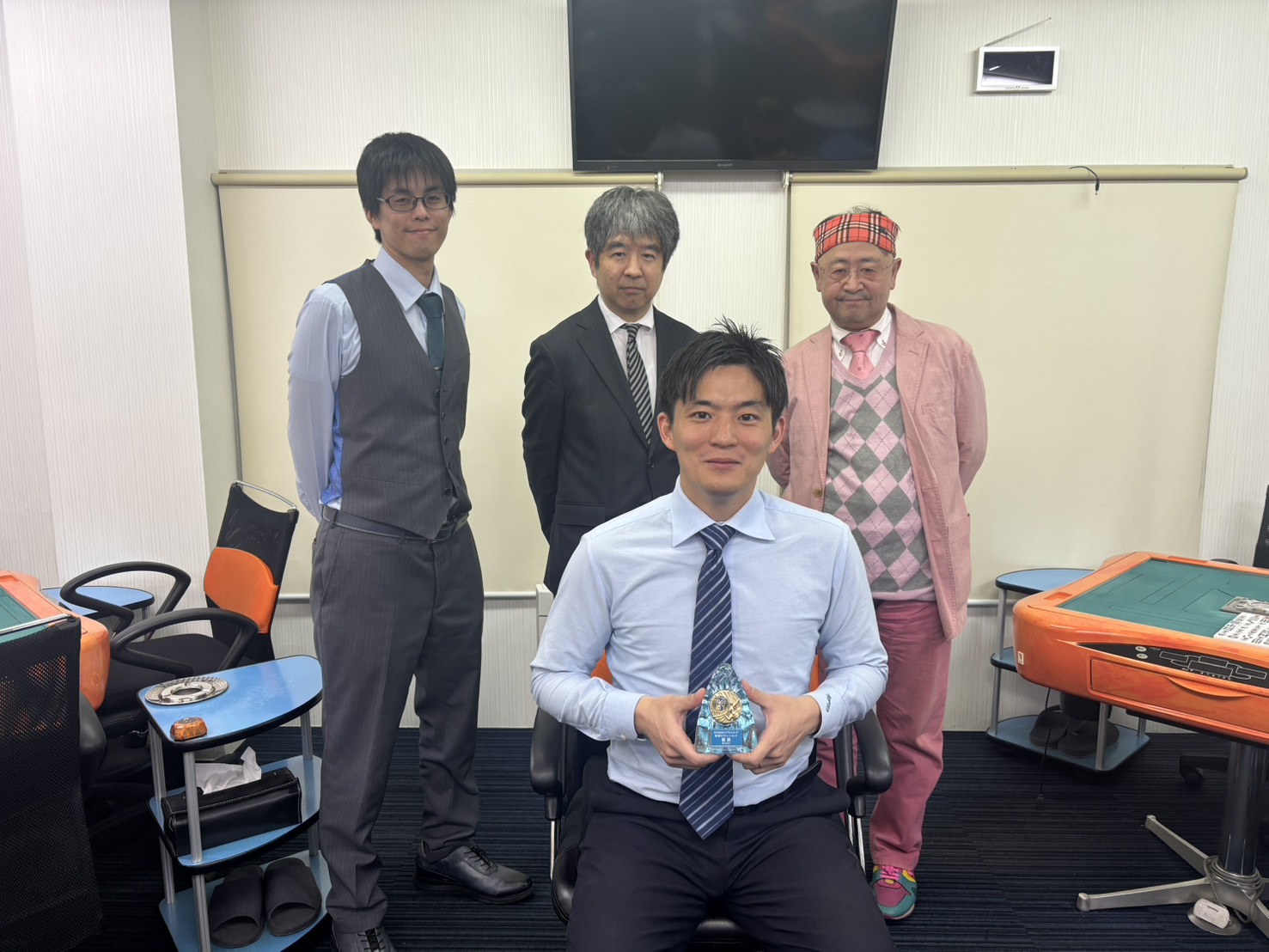 写真後列(左より)4位(戸井田岳大 B級ライセンス)、3位(岩沢和利 B級ライセンス)、2位(奥山敏行 日本プロ麻雀協会)